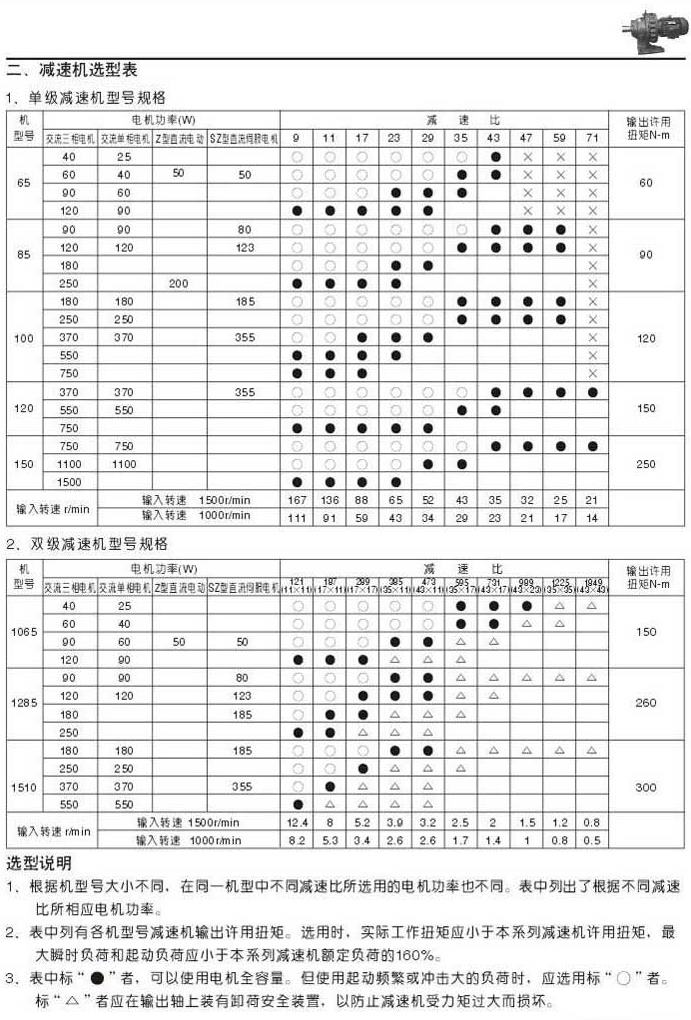 WB系列擺線針輪減速機選型表單級減速機型號規格表雙級減速機型號規格表選型說明