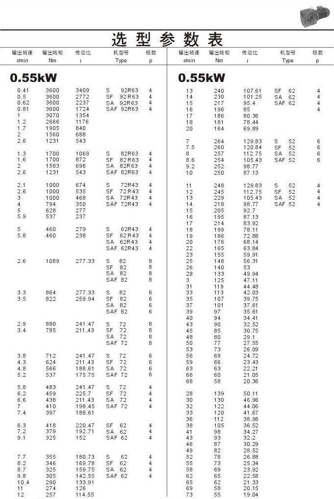 選型參數表0.55kW